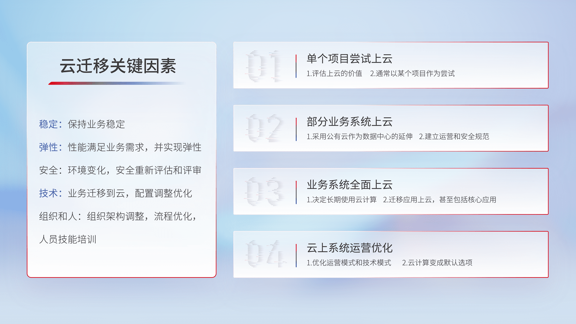 结合实际业务,,从规划设计、、云平台选型、、、、云原生改造、、数据迁移、、、集成交付,,,迁移全过程为客户识别最佳上云路径,,做好风险识别管理,,,设计网络架构、、身份权限、、、、安全审计合规、、操作审计、、日志审计、、、、监控告警策略、、、多站点容灾设计等,,,对云上基础设施进行整体规划,,提升IT治理水平,,,,以满足弹性、、、高可用、、、、高性能的需求。。。。