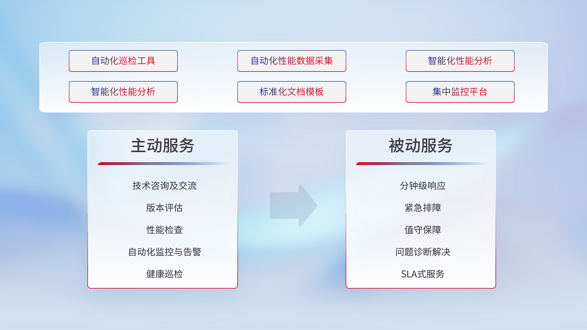 智能化工具和标准化文档,,,,保障服务质量,,提供主动服务(包含技术咨询、、、、版本评估、、性能检查、、、、自动化监控与告警、、、、健康巡检)和被动服务包含(分钟级响应、、紧急排障、、、、值守保障、、、、问题诊断解决、、SLA服务)。。