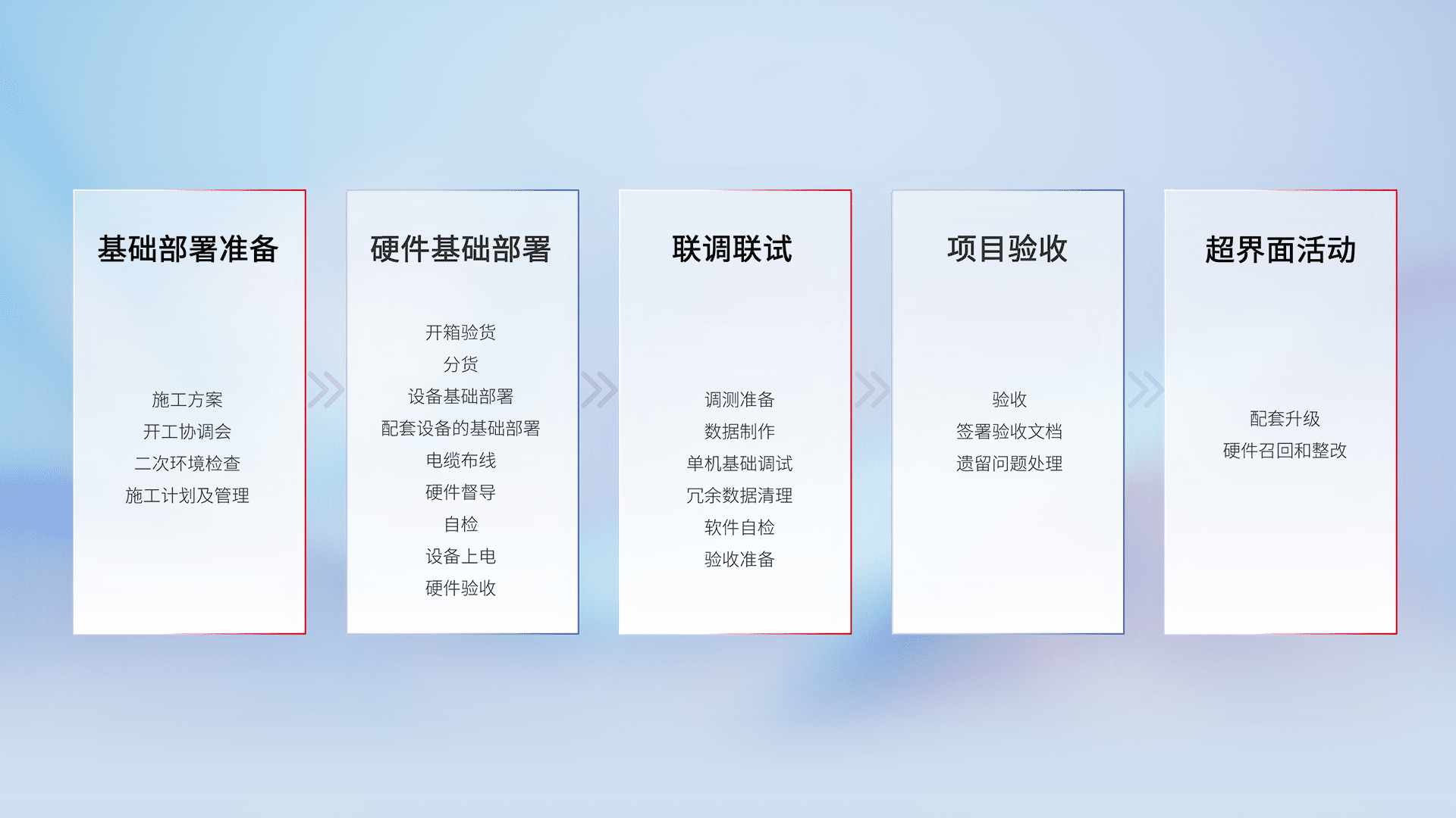 从基础部署准备、、、、硬件基础部署、、联调联试、、、项目验收、、越界面活动的全过程可追溯,,,保证施工质量和进度。。。